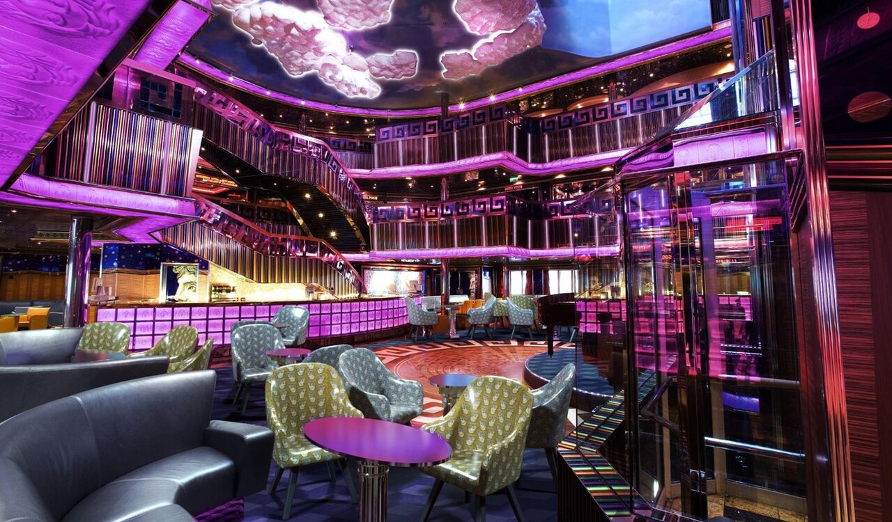 一旁重新設計的阿波羅大酒吧,空間配置摩登而舒適,可容納三百多人自在交流,無論是白天小憩,或夜晚隨音樂微醺,都自然成為船上最具人氣的社交據點之一。