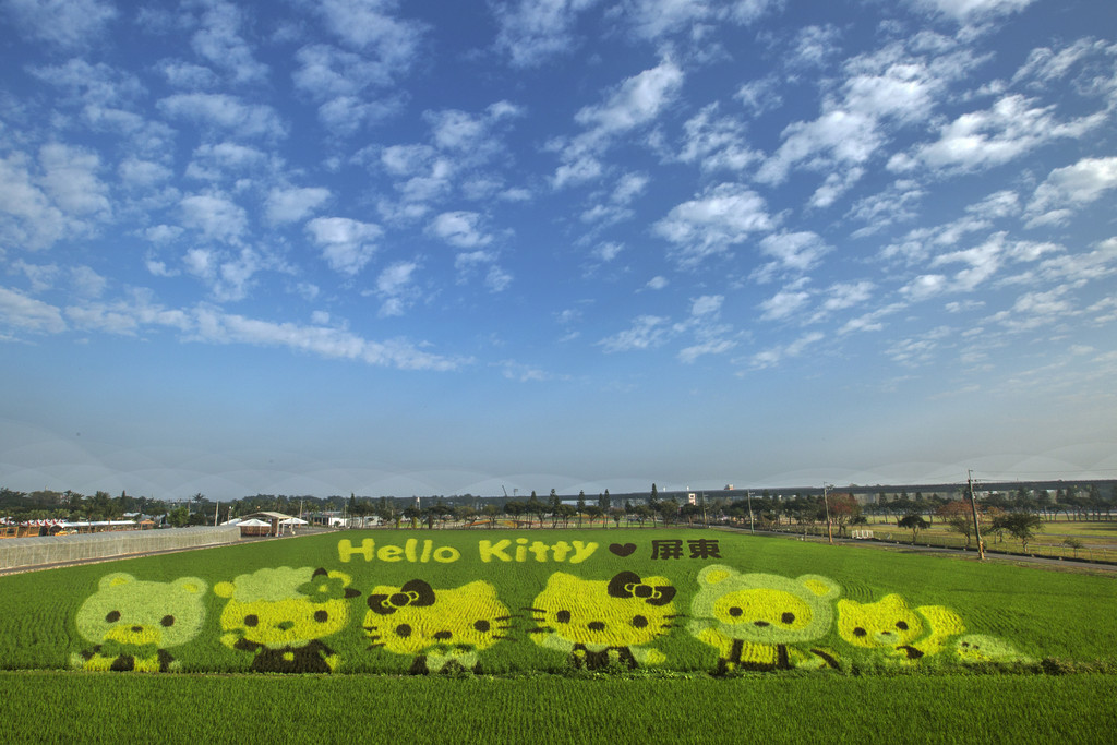 近幾年台灣各地彩繪稻田越來越可愛,而今年屏東熱博更找來了國際卡通巨星Hello Kitty代言,創造全球唯一3D立體Hello Kitty彩繪稻田,其運用農試所育成彩稻品種紫、白、黃、黑、綠共5色所打造。