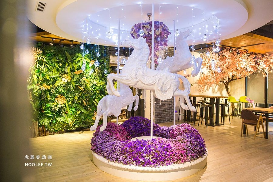 CandyFloss Flower&Caf’e 棉花糖花藝 提供法式甜點師傅特製甜品,還有WHITTARD英國茶,可以來一場甜蜜的浪漫下午茶約會,而且甜點飲料會隨機搭配手作花藝或燭台,感覺超浪漫的!花藝起家的CandyFloss Flower&Caf’e會每天變換花藝佈置,店內也有許多婚禮佈置的道具,不定期增加一些特別的裝置,最特別的就是超華麗的旋轉木馬啦!喜歡拍照的吃貨們應該會拍瘋了(笑)另外還有供應真花及永生花可自行選購,每週也會開設花藝教學課程,有興趣的話可以上店家粉專報名~