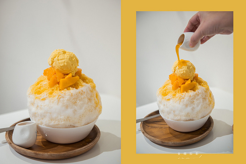 芒果淋醬、愛文芒果丁、煉乳與芒果冰淇淋,集合著滿滿的芒果,擁有飽滿的夏日鮮黃。刨冰口感清脆,帶著酸甜的芒果香氣,挖開刨冰之後裡頭也有其實芒果的味道沒有想像中的突出,煉乳的味道也不明顯,覺得稍微可惜,不過上頭的冰淇淋倒是為刨冰增色些。