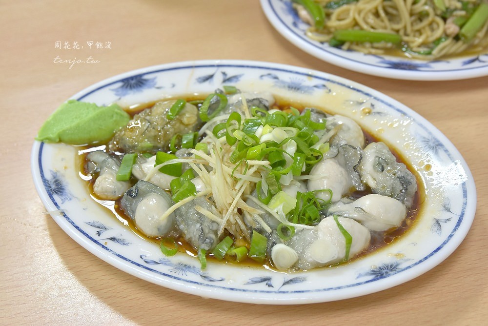 最喜歡的菜色是這套汆燙蚵仔。光看蚵仔的個頭就夠銷魂,鮮嫩肥美裹上薄薄一層粉,在料理之後size不會縮水。醬汁同樣有加入麻油,簡單配薑絲就很好吃,非常推薦這道可點。