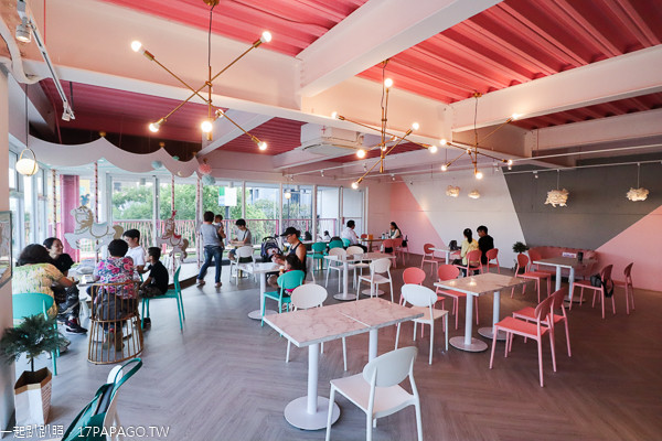 更浮誇的還在後頭,走上二樓用餐區天花板、牆面全是粉紅色,寬敞的座位區有許多馬卡龍色系桌椅可以坐下用餐,就連桌子都是夢幻的白色大理石紋。來到這絕對不想乖乖坐著,熱帶叢林風牆面、旋轉木馬、粉紅貴妃椅拍都拍不完,還有可愛情侶彩繪牆可以打卡,店家甚至在一旁準備了拍照道具,粉紅控路過絕對要進來休息打卡一下。