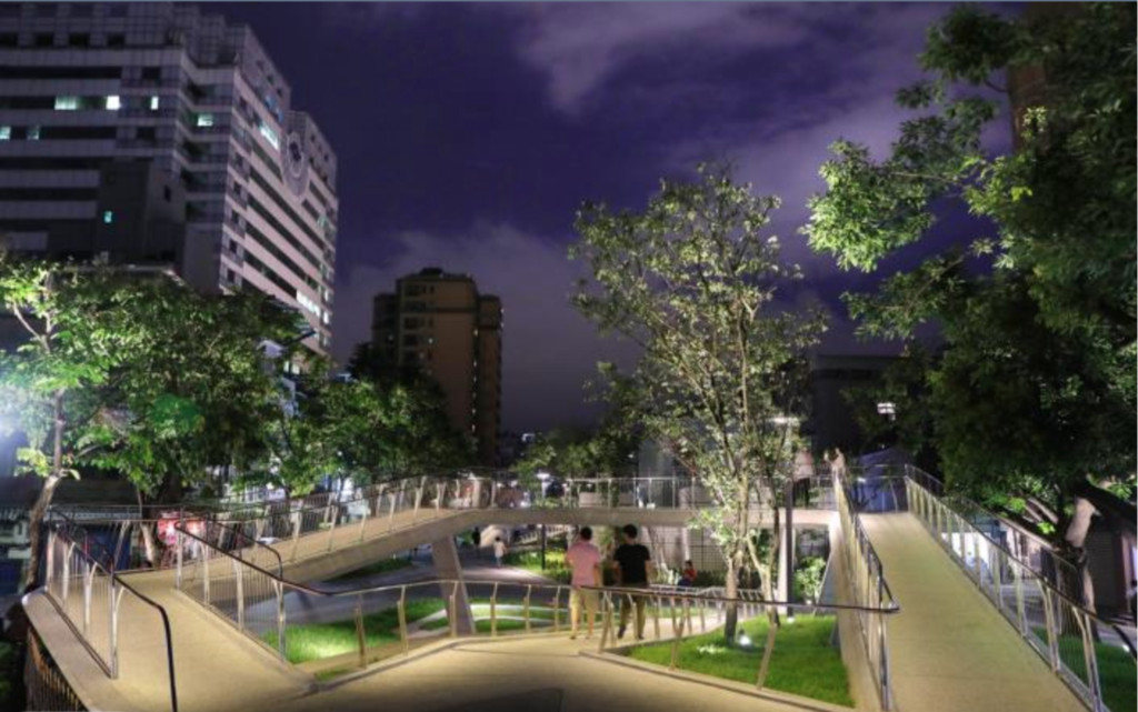 以「心中山舞台」為起點,綠色線形廊道串連「遊人啡飲」、「月光森林」、「爵士廣場」及「星橋綠坡」。「遊人啡飲」中,將有周邊商舖或活動舉辦空間,且透過「月光森林」季節主題植栽,入眼滿滿的自然風景,讓心靈放鬆充電。而「爵士廣場」為附近居民休閒運動的好所在;「星橋綠坡」已是熱門打卡點,星空光橋搭配燈光投射,在夜景烘托下,特別有情調。