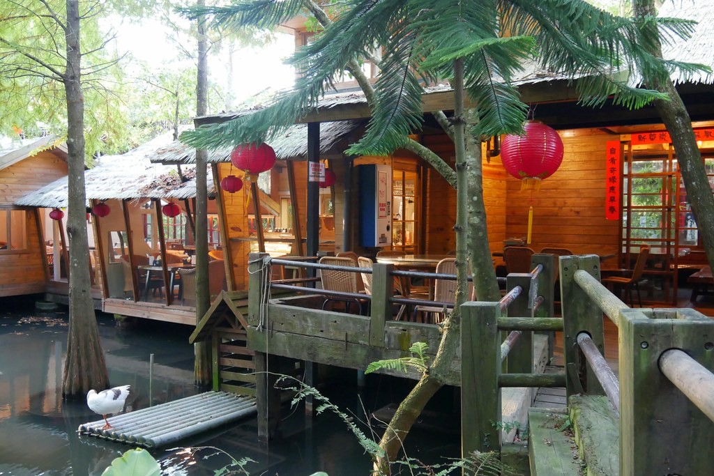 吃完午餐之後我們立刻到屋外走走,這才發現原來「卓也小屋」這麼美,木橋搭配紅燈籠和水流,整個很像江南風情,我們當下覺得這環境也太讓人驚艷了!這個水池是人工池,裡面還有種落羽松,水裡還有鵝和鴨,整個好浪漫。