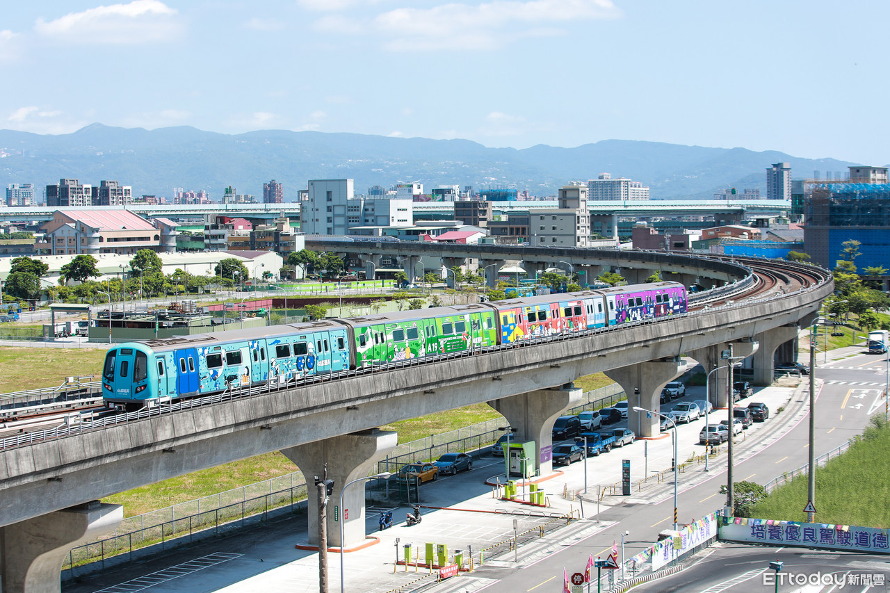 ▲桃園機場捷運最新彩繪列車外觀,繽紛色彩很吸睛,也加入很多青埔周邊景點。(圖/記者周宸亘攝)