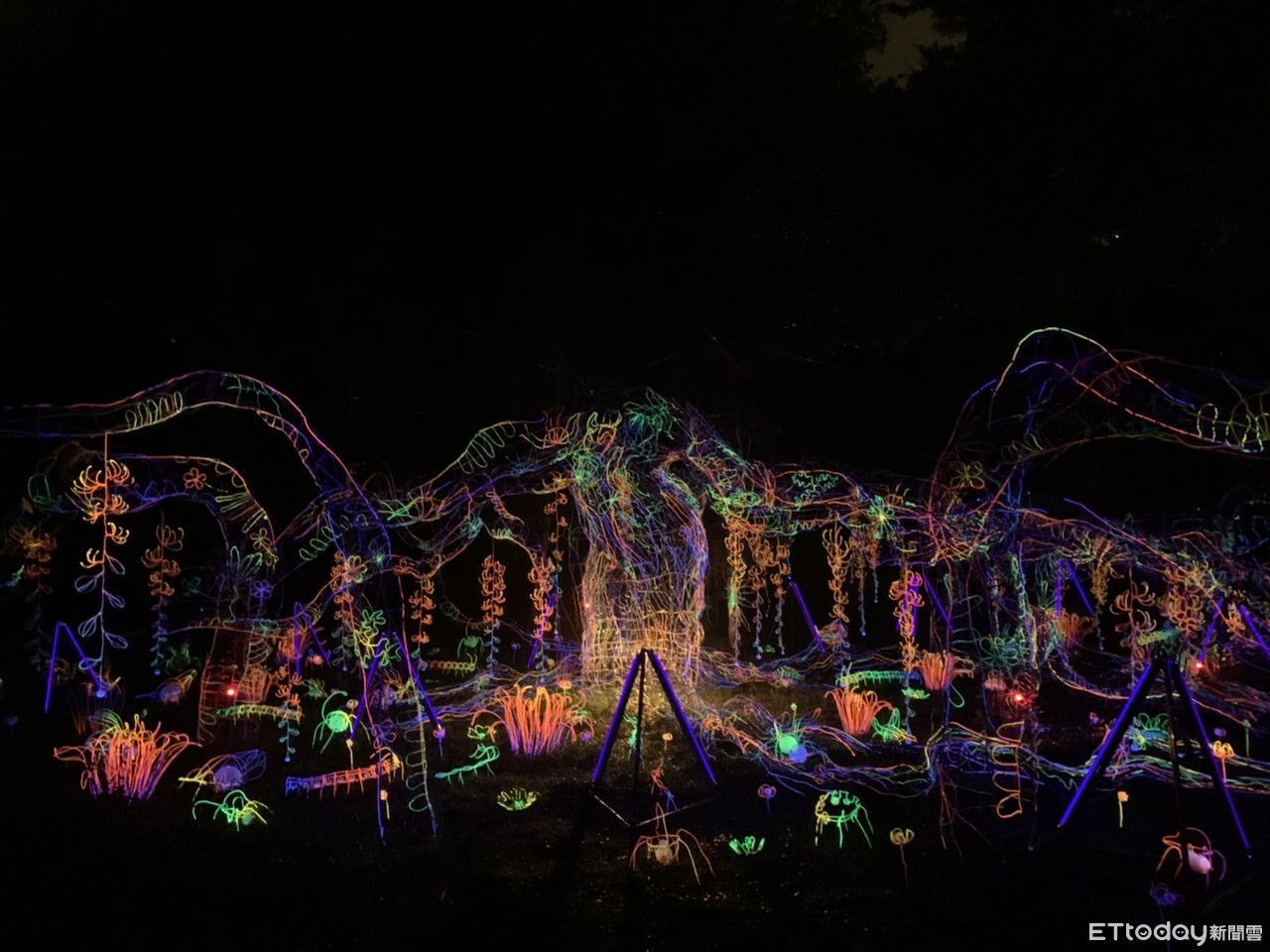 走完整個公園大概需要30~40分鐘,沿途都能看到許多夢幻燈飾,其中最刺激的絕對是走過「化蛇纖影」,這座燈飾就掛在吊橋上,夜晚一片黑,完全看不見橋下的風景,你只能聽著潺潺流水聲並驚呼這片美景,慢慢走過。公園尾段的「流光樹林:團聚」也很精彩,滿地都是七彩燈飾,甚至還有燈飾垂掛在半空中,拍起來超級夢幻。