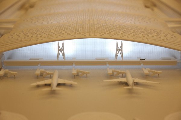 ▲桃園機場第三航廈國際競圖首獎模型正面意象示意。