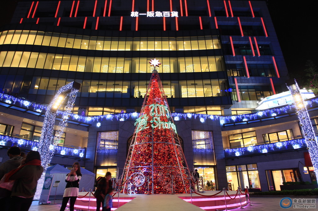 隨著耶誕佳節的腳步越來越近,全台各地也換上了耶誕新裝以及燈飾。被視為商業一級戰區的信義商圈,近日來也紛紛陳設出各式各樣的耶誕節裝飾。市府阪急百貨廣場除了有一棵10公尺高的耶誕樹,還規劃有幸福之門、美人大道、光之隧道等主題燈區,讓現場帶有濃濃的佳節氣息。