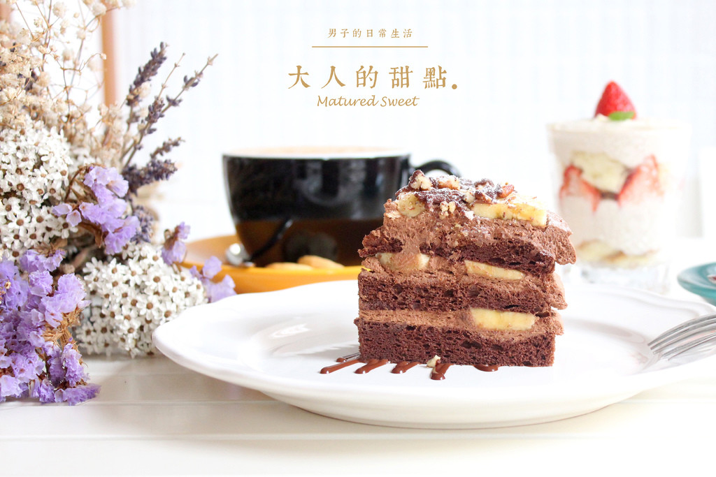 紮實的巧克力蛋糕體上,夾著店家使用生巧克力和鮮奶油特製的甘納許,口感質地較為濃稠,濃郁的巧克力甜香,再加上新鮮香蕉切片,三層的組合,最後再灑上點巧克力脆片和核果,非常地有層次,甜度七、八分,但若巧克力蛋糕體再軟一點就更完美了。