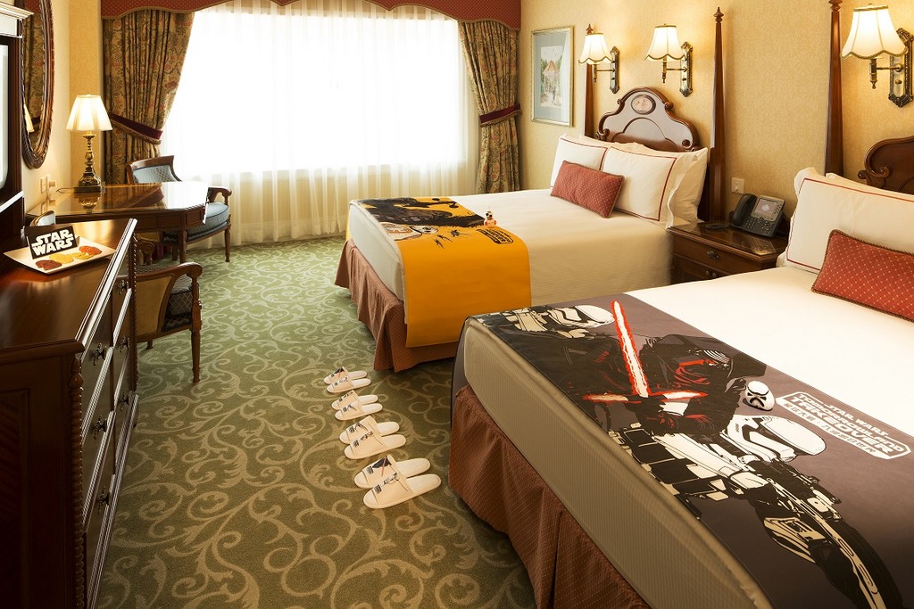 即日起至9月30日期間,香港迪士尼樂園酒店及迪士尼好萊塢酒店將《星際大戰》的正邪勢力蔓延到客房之中,旅客預訂任何房間,只需另加港幣$600,房間就可變成《星際大戰》主題房間佈置,包括《星際大戰》主題門貼裝飾、拖鞋、床旗佈置以及《星際大戰》造型餅乾,讓整個住房體驗也變成電影場景。