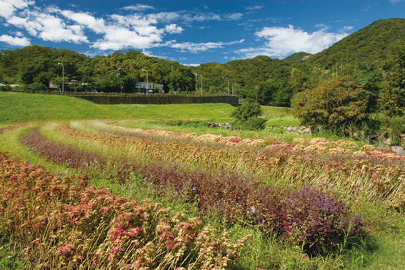 想像不到捷運大湖公園站步行10分鐘距離,就有超大一片草地、花毯。整座親水園區裡除了一大片綠油油的草皮,還有溪流、步道、涼亭、小橋,清澈溪水讓人能見水裡悠游小魚,觀察這裡豐富的生態環境。