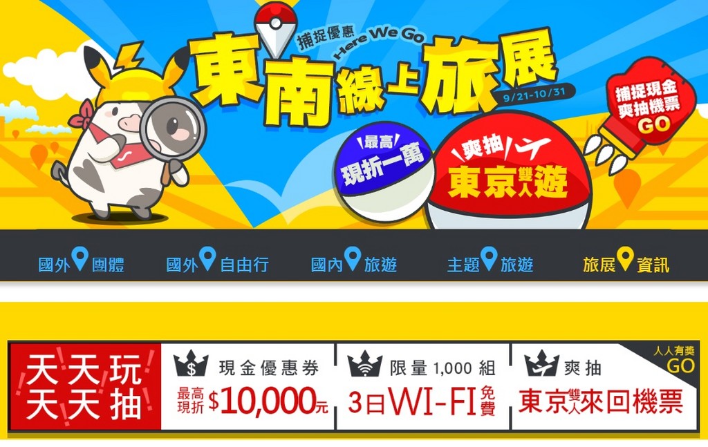 東南旅行社舉辦線上旅展,從即日起到10月31日為止,舉辦天天玩、天天抽活動,凡登入會員玩遊戲,就能立即捕捉免費出國WI-FI上網及高額旅遊金,最高享一萬元現金折價,還有機會爽抽東京雙人遊喔!