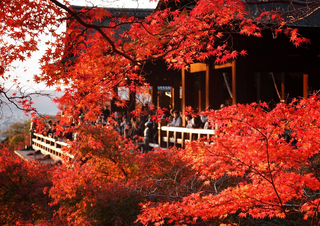 站在內院眺望,清水舞台彷彿從樹林中升起,秋季時節被楓紅圍繞;站在清水舞台下方,從茂密的枝葉中仰望,透過片片楓葉,彷彿時光也為此情此景而暫停。