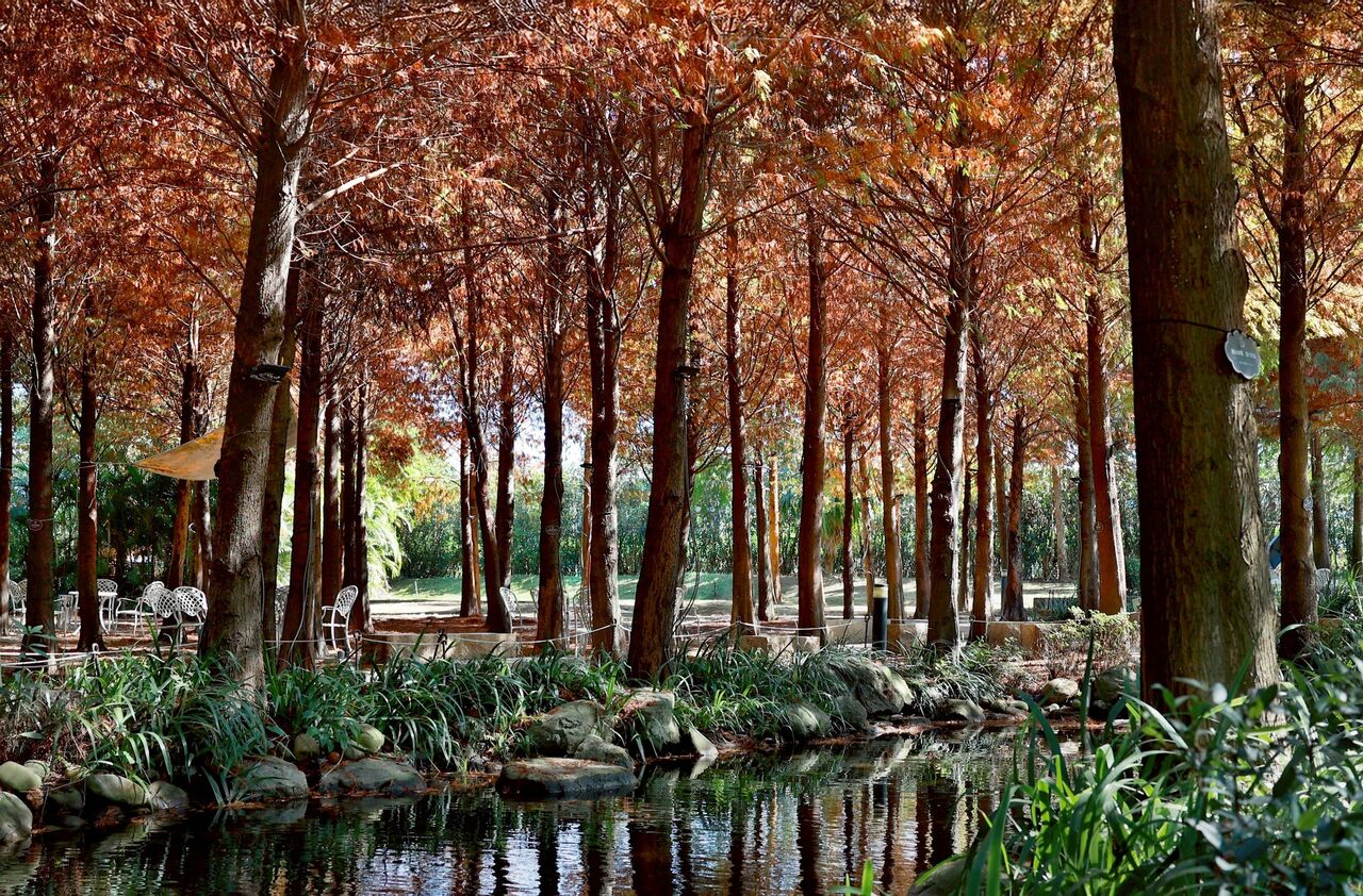 業者在園區內也種下約700棵落羽松林,隨著冬季到來,落羽松已悄悄轉紅,旅客可漫步林間,站在橋樑上以火紅樹林為背景拍照,或坐在樹下享用餐點。