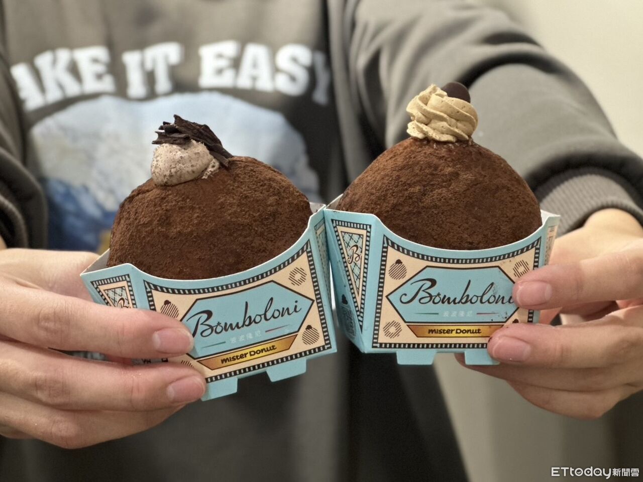 Mister Donut全新「咖啡歐蕾波波隆尼」、「巧克脆脆波波隆尼」分別在波波隆尼圈體中注入微苦咖啡鮮奶油、帶有可可碎片的可可鮮奶油,最外層再撒上醇厚可可粉,每一口都能吃到滿滿內餡,售價皆為69元。