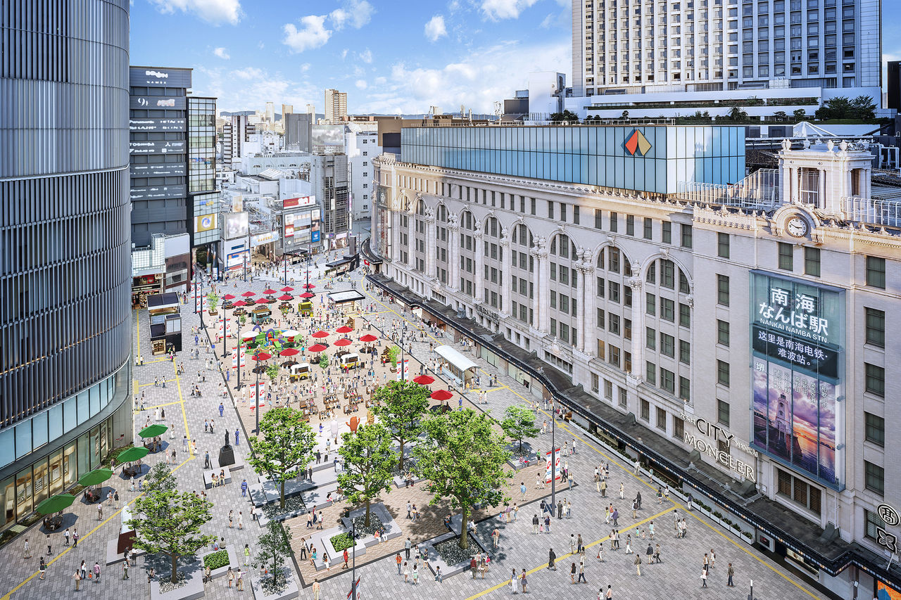 為了創造難波地區新面貌、吸引更多旅客造訪、創造經濟效益,以及迎接2025年大阪關西萬博到來,僅供行人來往的「難波廣場」率先啟用,且24小時開放,旅客可以坐在露天座位享受咖啡時光、休息,也可以自由遊走在不同百貨之間。