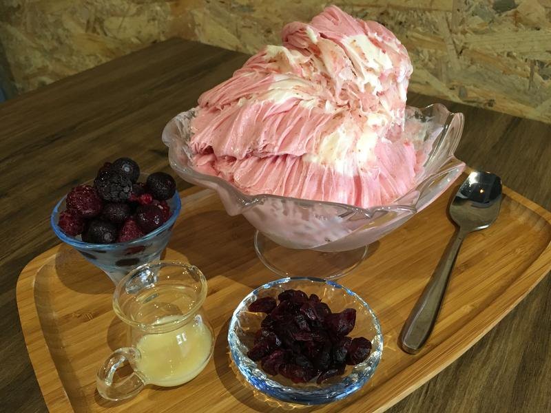 公館店限定款是「莓大莓小雪果冰」,冰磚是用草莓、有機蔓越莓和義大利優格製成,刨冰時有讓雪花冰的厚度較厚,吃起來不會太快融口,相對優格的香氣和莓果的酸甜味也更加明顯,吃的時候還可以搭配果粒、果乾,淋點煉乳味道更香甜。趁夏天還沒結束前,來這涼一下吧!