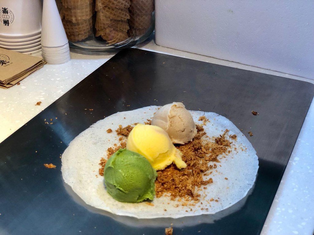 宜蘭傳統美食花生捲加冰淇淋,是不少人到宜蘭必吃的古早味甜品,倆樂 LiAng Le主打使用50年老店製作的餅皮、花生磚,以及和台灣在地小農合作自製出的水果冰淇淋,有芒果、芭樂、香蕉等口味,標榜不添加任何香精、色素及防腐劑,另抹茶、芋頭也是不少人力推的口味之一,Q彈餅皮鋪上滿滿一層麥芽花生糖,接著放上一顆顆顏色鮮豔的叭噗,畫面療癒到不行,吃過的民眾也大呼「值得再去」,評價極高,提醒當天有提供的冰淇淋口味會公佈在牆上。