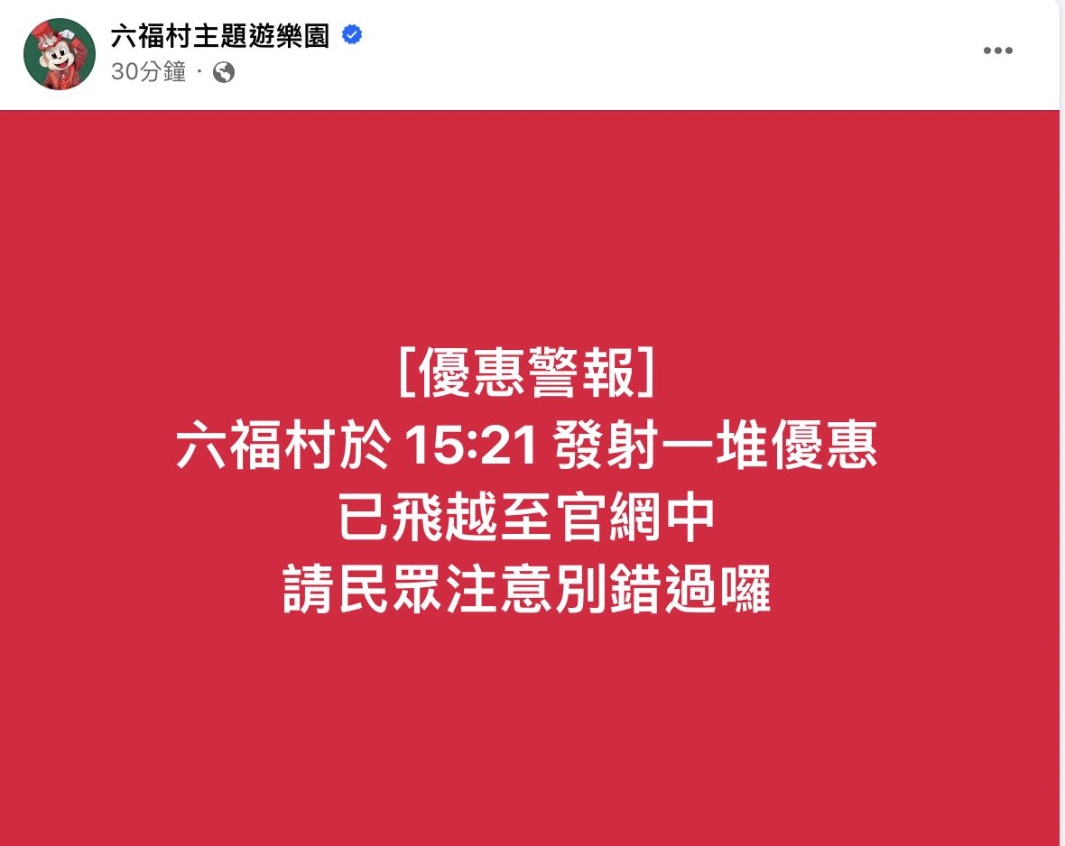 六福村臉書專頁稍早發布一則「優惠警報」貼文,六福村已於15:21發射一堆優惠,已飛越至官網中,請民眾注意別錯過。該貼文一發,立刻吸引破千網友按讚,有人留言「超有梗」、「小編不錯耶,夠及時,很可以」、「懂玩」,但也有人不認同,質疑「危機當有趣」、「一點都不好笑」、「不能接受有人或店家拿防空警報來開玩笑」、「拿國家可能發生的危難,來當行銷手法很不恰當」。