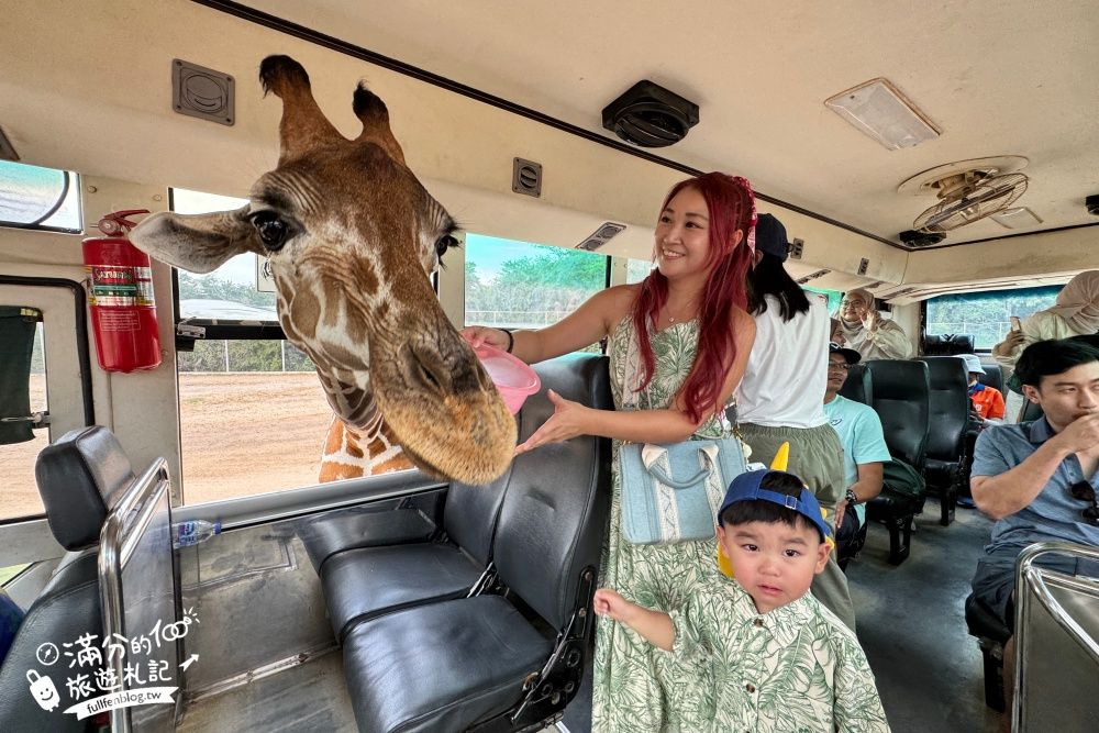 後來服務人員還拿多拿飼料讓滿分餵食,也讓ZAQ寶坐在車上餵長頸鹿,一系列與長頸鹿合影的相片滿分超喜歡,畢竟這個在台灣根本沒有機會體驗到,這也是滿分第一次與長頸鹿這麼近距離的接觸,覺得好特別好好玩,長頸鹿也都很溫和,親子同遊一起體驗這項遊程真的是太有趣又好玩,相信不僅小朋友會印象深刻,大人一定也會很難忘。