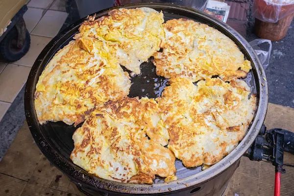 古早味蛋餅多是這種傳統的粉漿蛋餅,跟安和路一段的榮美餅舖有點類似,但是更多了一份酥脆感。餅皮在檯面上半煎炸出金黃色澤,酥脆微帶焦香氣,口感厚實裡頭彈牙軟柔,伴隨雞蛋下肚好不滿足,點一份快比連鎖早餐三份還多,也可以搭配上甜油膏與辣椒膏提出香氣。