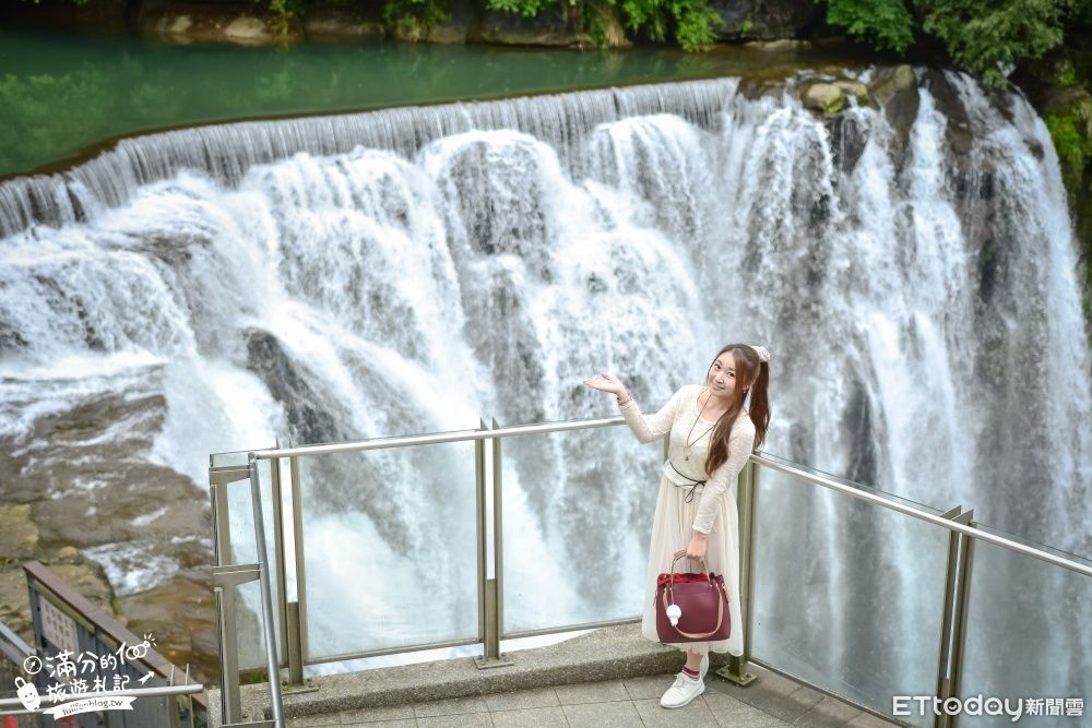 十分瀑布的外觀也很像水簾布幕一樣!特別的是,水流經過的奇岩斷層高高低低,水流像在坐造型溜滑梯,形成不規則的涓絲狀,當日午後迷霧籠罩,與瀑布景觀構成美麗圖畫,站在觀景台,雖說有段距離,卻也能和瀑布合影。