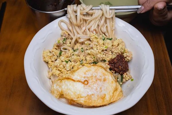 看似平凡的炒蛋卻一點也不簡單,整鍋雞蛋下鍋,加近海量肉末、蔥花、韭菜粒大火爆炒,家常的好味道挺涮嘴。不僅有冒油泡的蛋香,還有辛香與醬感畫龍點睛。再搭配上粗麵條更是一絕,特別的是不是普通的陽春麵,而是與汕頭意麵一樣有搭配上豬油。