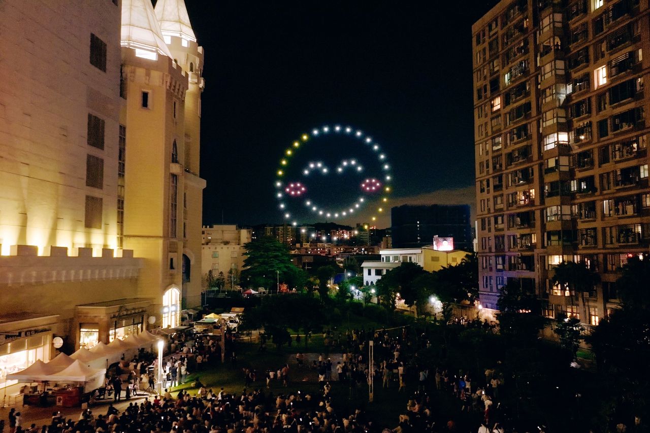 ▲無人機將在公園夜空排列成星星、笑臉等圖像,時間長達8分鐘。(圖/業者提供)