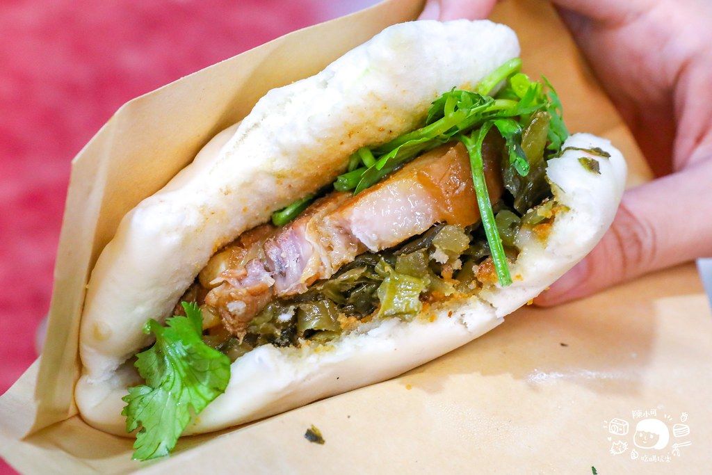 ▲從蒸籠拿出熱呼呼的刈包,撈了一匙花生粉再加上豪邁酸菜,最後放入滷五花肉及份量不少的香菜。
