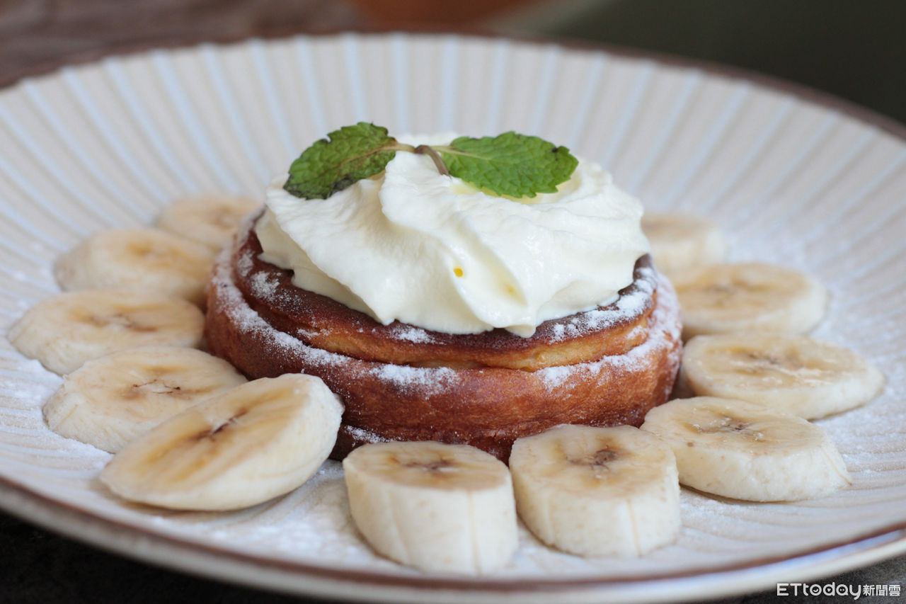 ▲花酒蔵Aplus Dining Sake Bar開始在周末提供早午餐,上圖為經典香蕉鮮乳清蛋糕。(圖/記者黃士原攝)