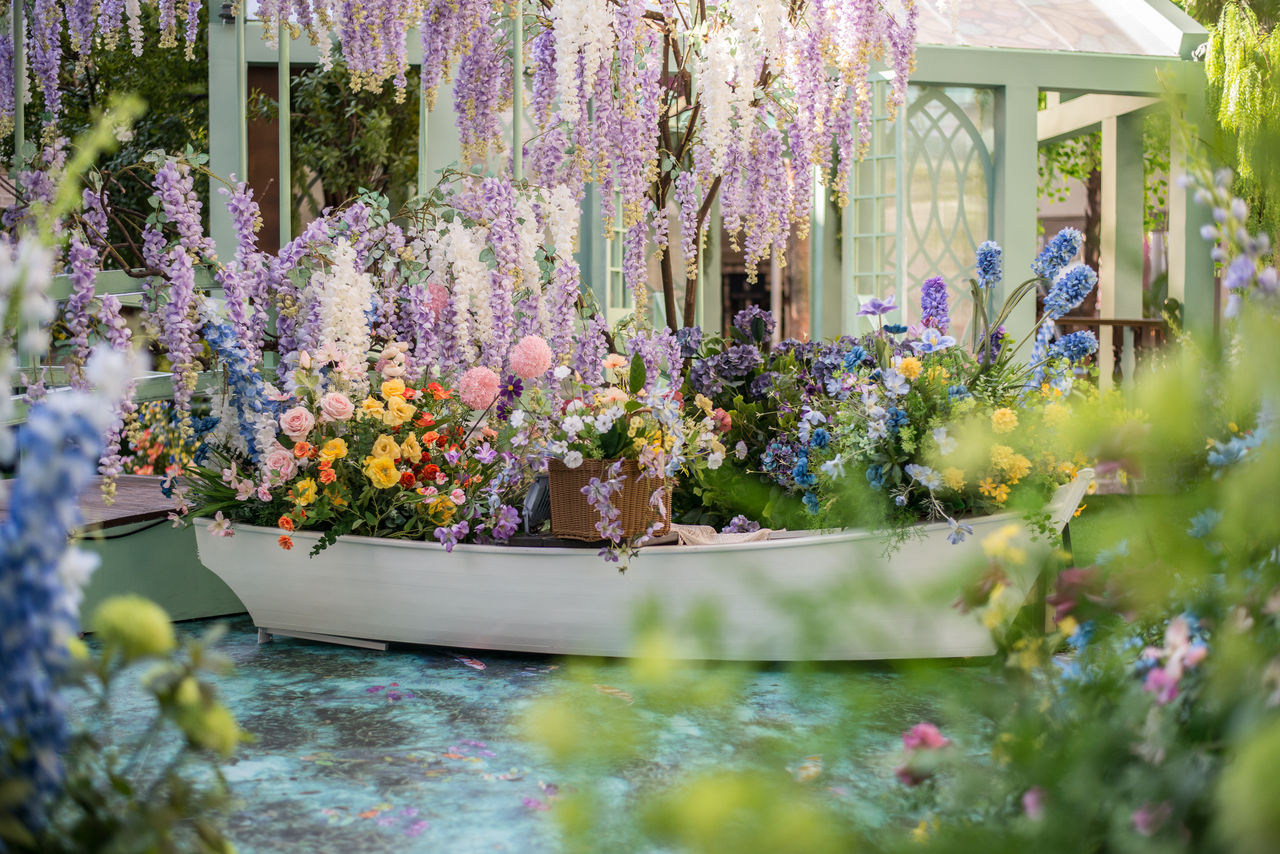 ▲▼「莫內湖畔」重現經典畫作,以花卉裝置搭配純白小船,並還原莫內熱愛的日式拱橋與繁花盛開的景象。