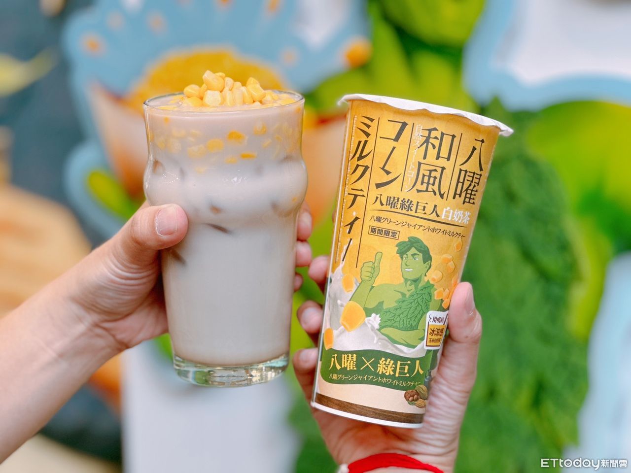 「八曜和茶X綠巨人」聯手打造吸得到玉米的咀嚼系奶茶「八曜綠巨人白奶茶」,選用以10種自然穀物熬煮的和風穀麥茶為茶基底,結合澳洲低敏燕麥奶及八曜特製奶精粉製成奶茶,再加入綠巨人於黃金採收期採收的飽滿玉米粒,且不含咖啡因,每杯售價99元,4月4日起於全門市上市,買還送「玉米加料兌換券」,各門市數量有限、送完為止。