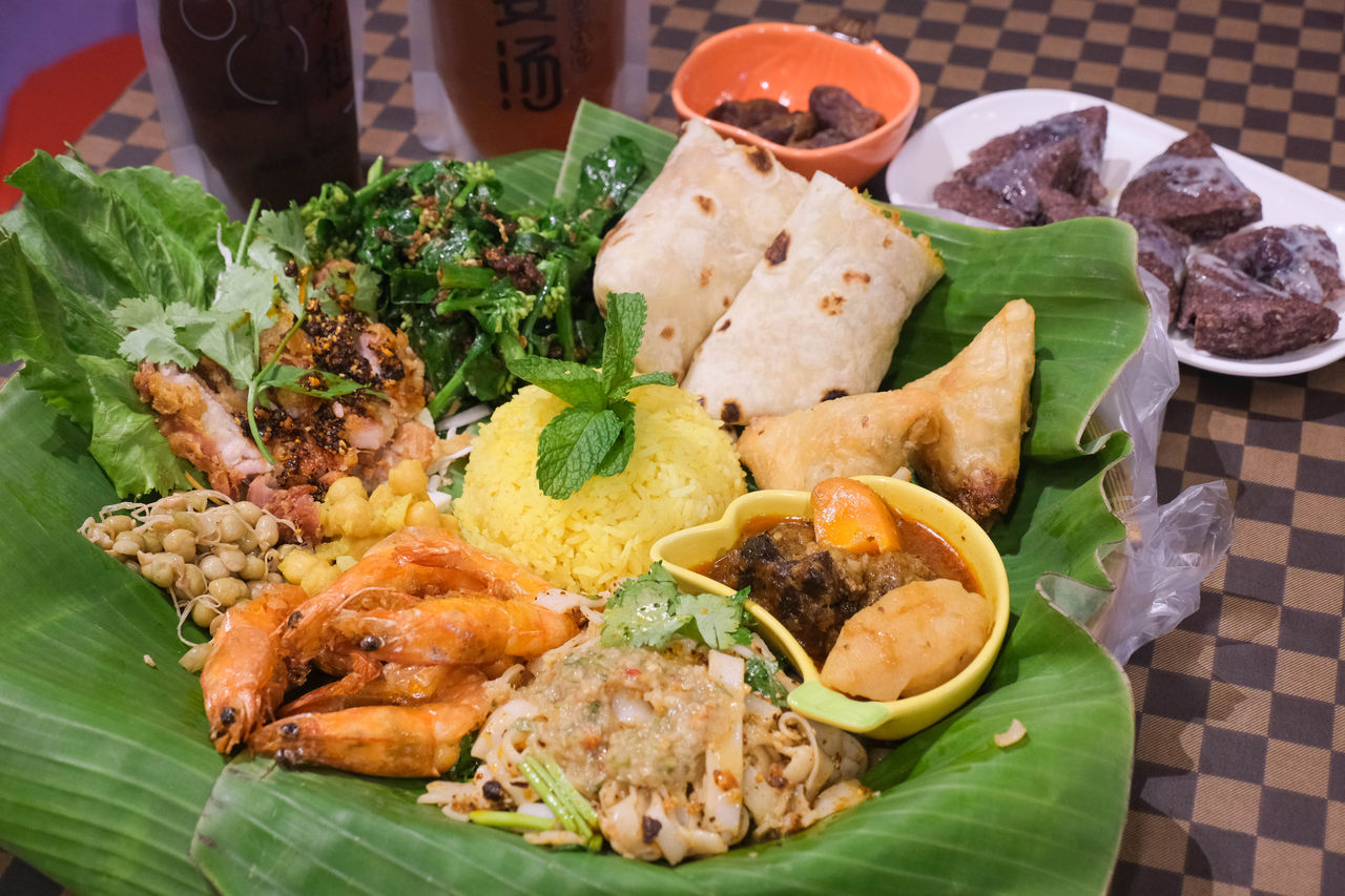 ▲▼清真合閃妹小廚餐點眾多,其中,簸箕飯保留用芭蕉葉包飯的習俗,吃得到清真認證的牛肉、椒麻雞、雲南米干、炸鮮蝦、炸金三角,甚至是印度咖哩。(圖/記者彭懷玉攝)