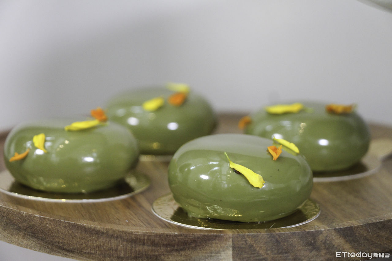 ▲外觀光澤如藝術品的「永續」,以巧克力抹茶慕斯包裹杏桃、檸檬、百香果餡,結合抹茶海綿蛋糕。(圖/記者黃士原攝)