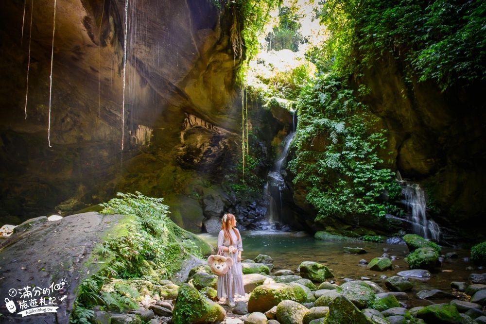 讓人覺得好驚艷,走進欣賞,發現洞穴裡有兩座瀑布,一大一小,涓涓流水,水流凝聚成一座小型的綠意池畔,此景讓人沉醉,也讓人心曠神怡。