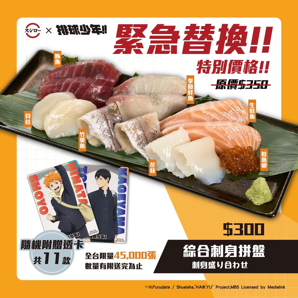 台灣壽司郎攜手日本超人氣動漫《排球少年!!》的聯名活動23日登場,由於鮪魚拼盤隨餐贈送的透卡最為熱門,全台一半門市還因此賣到鮪魚缺貨,業者昨天緊急將聯名餐點更換為「綜合刺身拼盤」,特價300元。