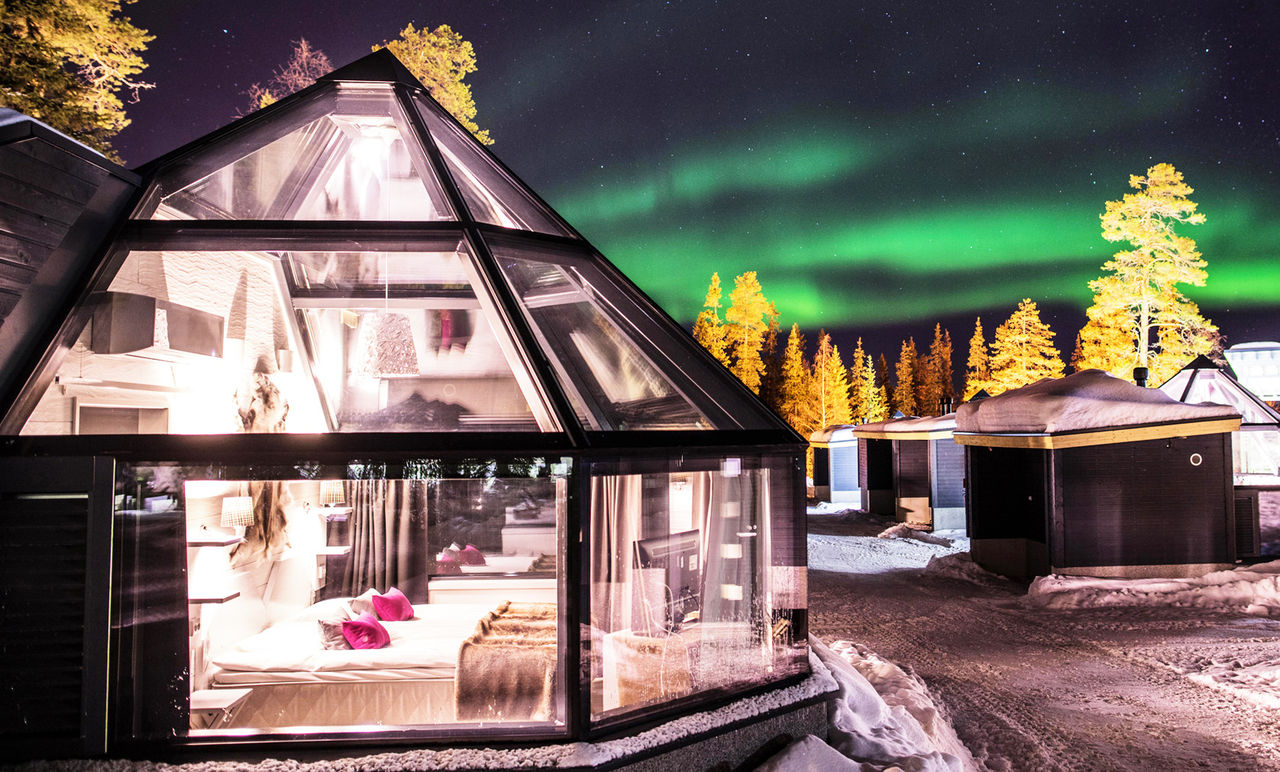走進芬蘭拉普蘭的雪白森林,宛如踏入童話世界。在這片銀白之境,坐落著一排排極光玻璃屋,如水晶般閃耀於雪地之上。夜幕低垂時,窩在柔軟暖被裡仰望穹頂,極光就在眼前悄悄舞動。