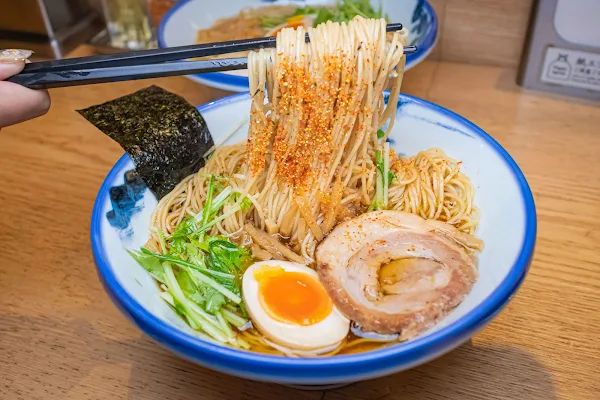 店內招牌品項,我們選擇的是濃味的細麵,搭配的肉品是雞肉。湯頭以蔬果、海鮮、國產雞與昆布精心熬煮,金黃澄澈的湯頭圓潤鮮甜,湯勺入口前還能嗅到柚子果香,前段的鮮鹹和尾段的清甜柚香令人驚艷,細麵條吸附醬汁清爽而開胃,扎實不軟爛。配菜有水菜、溏心蛋、海苔與筍絲,雞肉有點像是雞柳無骨而不柴澀,伴隨湯頭的清香好涮嘴。
