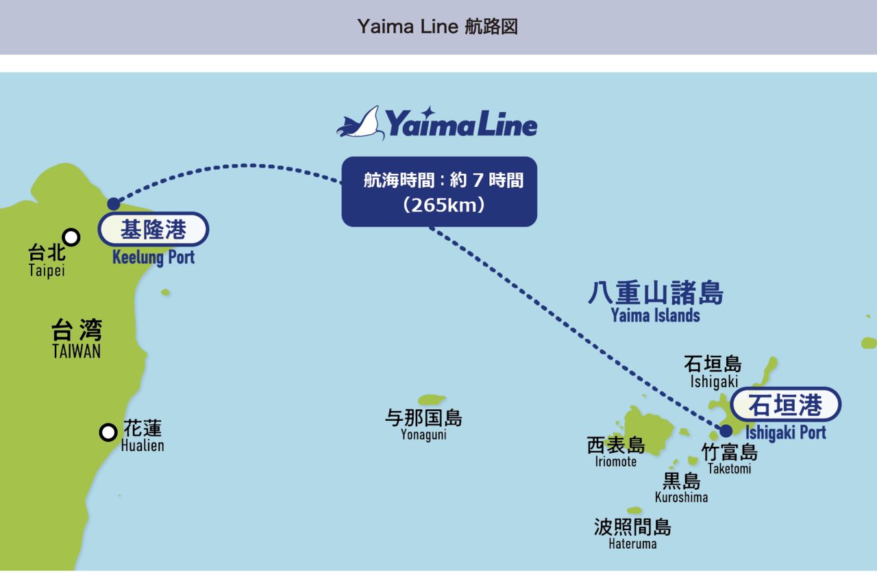 基隆至石垣島的RO-RO客貨輪暫定取名「YAIMA MARU八重山丸」,石垣島至基隆航班委由華岡集團經營,該渡輪總噸位2萬1688噸,船上配置全住艙可載545名旅客,貨艙可裝載70輛轎車及約90個40呎貨櫃(或同等材積/重量貨載),針對石垣島-基隆開航事宜,華岡集團低調表示暫不能回應。