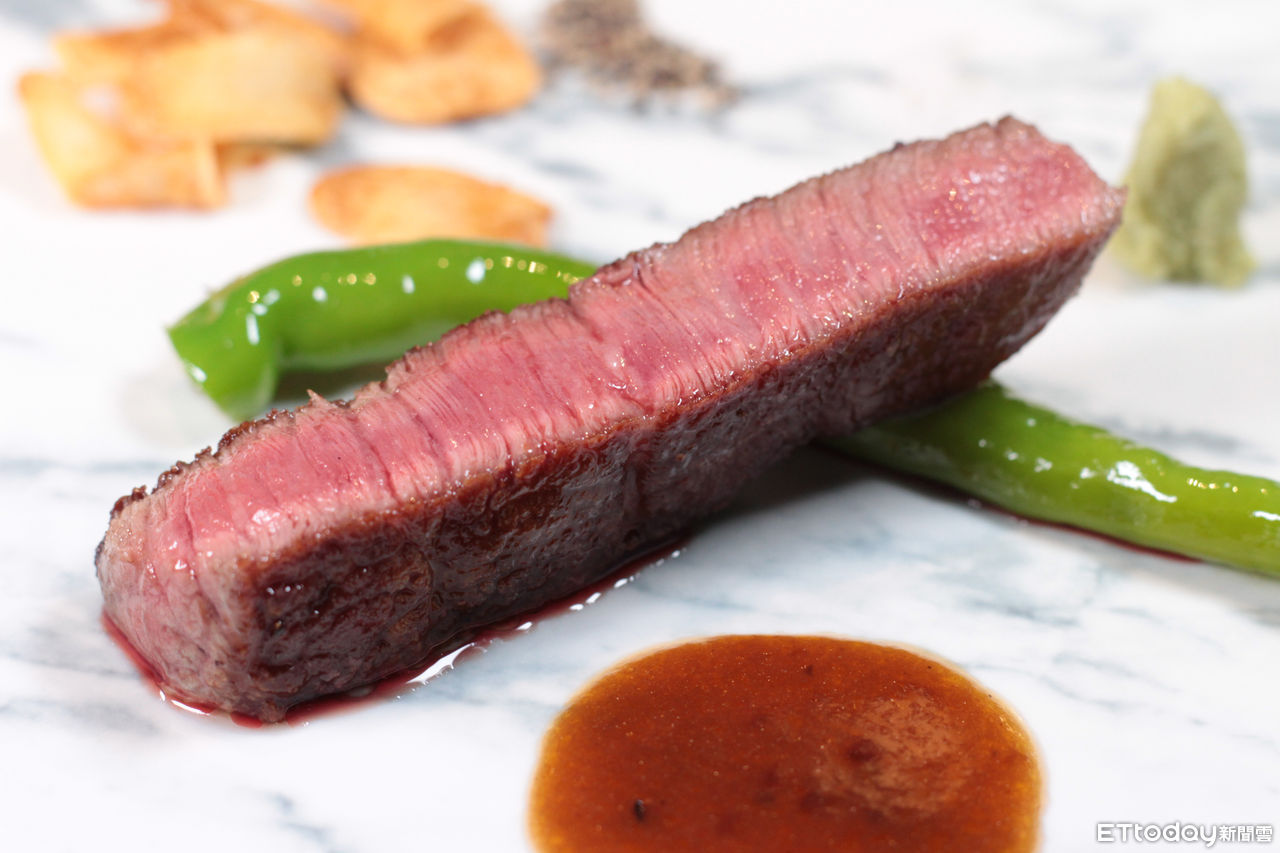 接下來還有蘇澳直送紅條魚、北寄貝及松葉蟹料理,其中「北海道松葉蟹佐蟹膏蒸蛋」中的蟹腳以日本大昆布及金桔包覆後,在鐵板清蒸方式來保留原始鮮味;主菜「夏多布里昂和牛A5」取自菲力核心部位,其肉質柔嫩細膩、油花均勻。