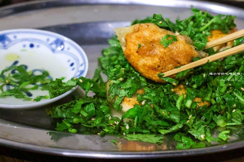 飽滿多汁,再將自家慢火熬製的雞高湯凝結成凍;包入煎餃裡,單吃先感受食材本身的鮮甜,沾一點青花椒油醋增添辛香,煎餃尬香菜一起入口,味道不搶風采,很有層次。