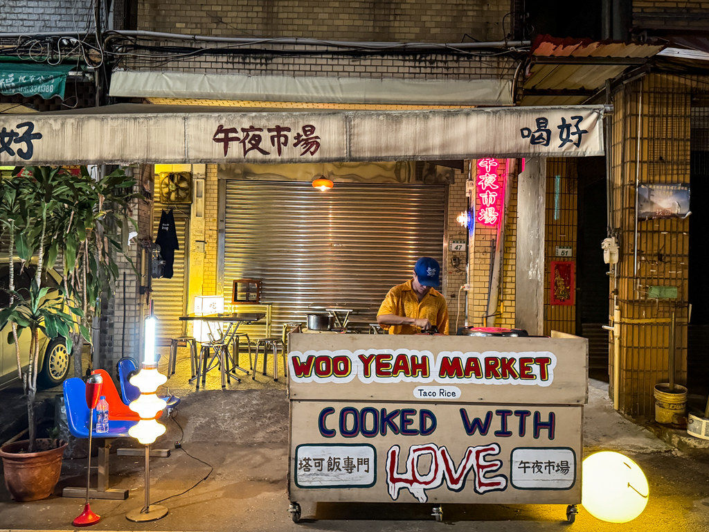 桃園大廟景福宮後方的永和市場,經過搬遷改建後還保留了早市時的熱鬧,而在夜色沉沉、街道逐漸安靜下來之際,民宅前方的「午夜市場 Woo Yeah Market」悄悄點亮的燈光,低調卻極具風格,主打塔可飯與乾咖哩的創意料理,營業到凌晨一點,半夜想吃些不一樣的美食填飽肚子時,不妨可以來嘗試。
