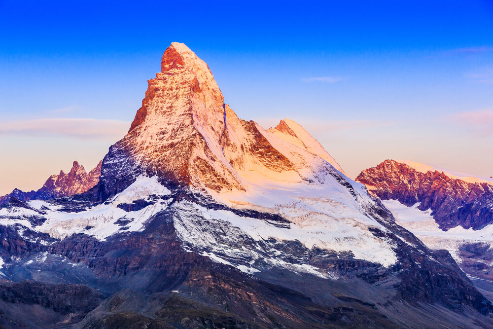 在瑞士眾多的山峰中,馬特洪峰可說是知名度最高的一座,曾是巧克力品牌Toblerone的包裝靈感來源。遠觀馬特洪峰,三角椎尖頂直插雲霄,氣勢萬鈞;天氣晴朗時,倒映在湖面的山景更是令人屏息,吸引無數攝影迷與山岳愛好者朝聖。