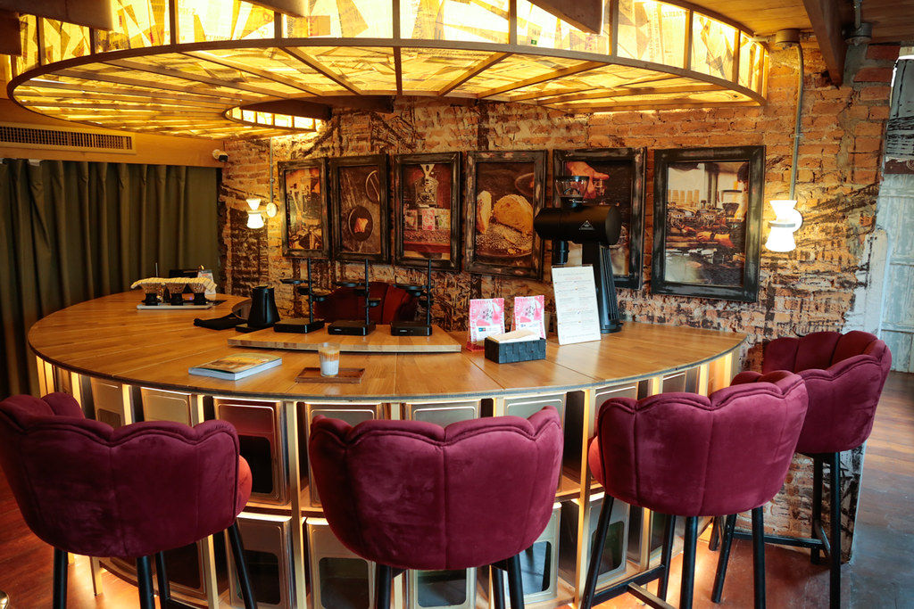 二樓的空間設計類似一座老電影院,重現了經典藝術與現代美學的交會,許多泰國在地人與國際旅客都特別為了這個空間來此朝聖。彷彿穿越回到某個迷人的老曼谷時光,紅磚牆、懷舊照片畫作與金屬工業風混搭出一種復古摩登的味道。圓形吧檯搭配天花板上老報紙的光影設計,讓整個空間氛圍溫潤、柔和,也可以在這裡學習手沖咖啡。