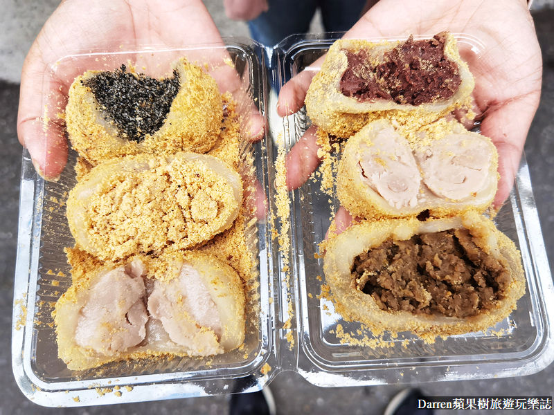 每顆現做麻糬都很大顆,上面灑滿許多花生粉,拿在手上就能明顯感受到麻糬的重量。店家給料真的很大方,可以看到不論是芝麻或花生內餡都直接爆出來,拿起來就跟流沙一樣會往下流,餡料也不會過甜。紅豆和綠豆口味則是偏綿密,入口會有沙沙口感,芋頭咬起來軟綿、有淡淡芋頭香氣。