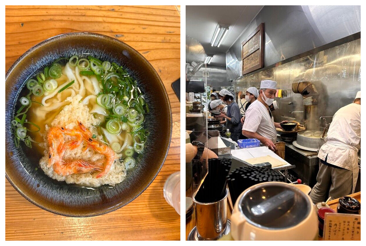 烏龍麵除了麵條外,最注重的便是湯底,這部分福岡以微金黃的清澈湯底見長。在福岡許多烏龍麵老店,都可以看到這些湯被裝在瓷罐裡,掛在煮烏龍麵的釜邊上加熱,煮好的烏龍麵再過冰水後加上熱熱的湯底,便是一碗福岡人口中最基本不過的烏龍麵。這家的湯頭非常清澈清爽,也少了前幾家我有一點納悶的微酸,搭配大量的蔥花,還有一點點化在湯中的天婦羅鹹香,蠻涮嘴的。
