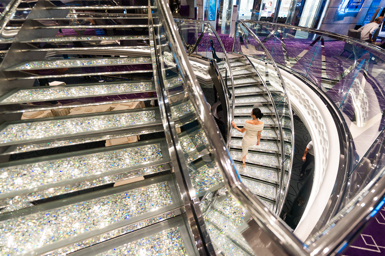 位於MSC榮耀號的經典大廳 - 施華洛世奇水晶旋梯,以數萬顆水晶打造出閃閃發光的階梯,如同從童話走出的宴會女王場景。站在水晶階梯前,每一步都像走進時尚大片,無論白天夜晚、正裝或休閒風格,這裡都是相機永遠拍不膩的夢幻舞台。