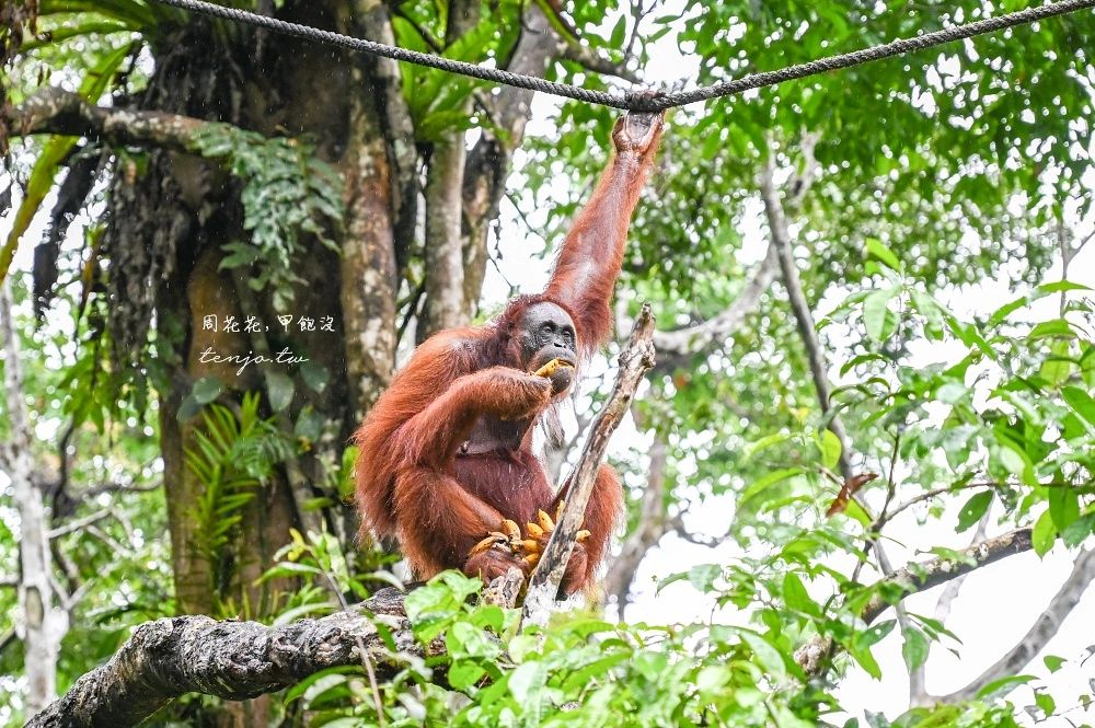 因為是野生放養,不一定能看到紅毛猩猩,尤其是在天氣不好的時候,或者是水果盛產的季節,紅毛猩猩可能會自行覓食,就不會再回來吃水果了。我們來的這天天空下著細雨,原本還很擔心紅毛猩猩不會出來,沒想到一次來了好幾隻,真的非常幸運。