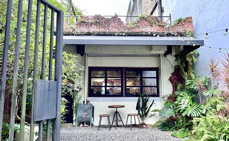 ▲推開鐵門是一座舖滿碎石的庭園,綠色植物、一張小圓桌、兩張小圓凳,配上身後的木窗和隱約穿牆而出的咖啡香。
