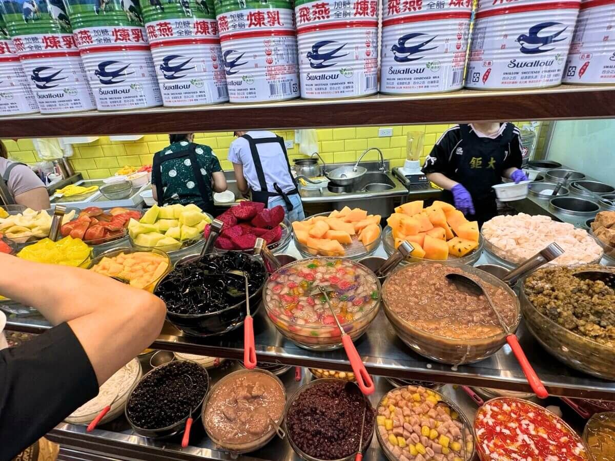 鉅大冰城最具特色的,就是它的自助吧台,從傳統豆類、粉粿、芋圓、仙草、愛玉、杏仁凍,到各式果凍、蜜餞,再到新鮮水果如芒果、西瓜、火龍果、鳳梨、香蕉等等,選擇多到像逛水果攤,每樣都乾淨新鮮、色彩繽紛,讓人看得眼花撩亂、每次都忍不住「什麼都想夾一點」。
